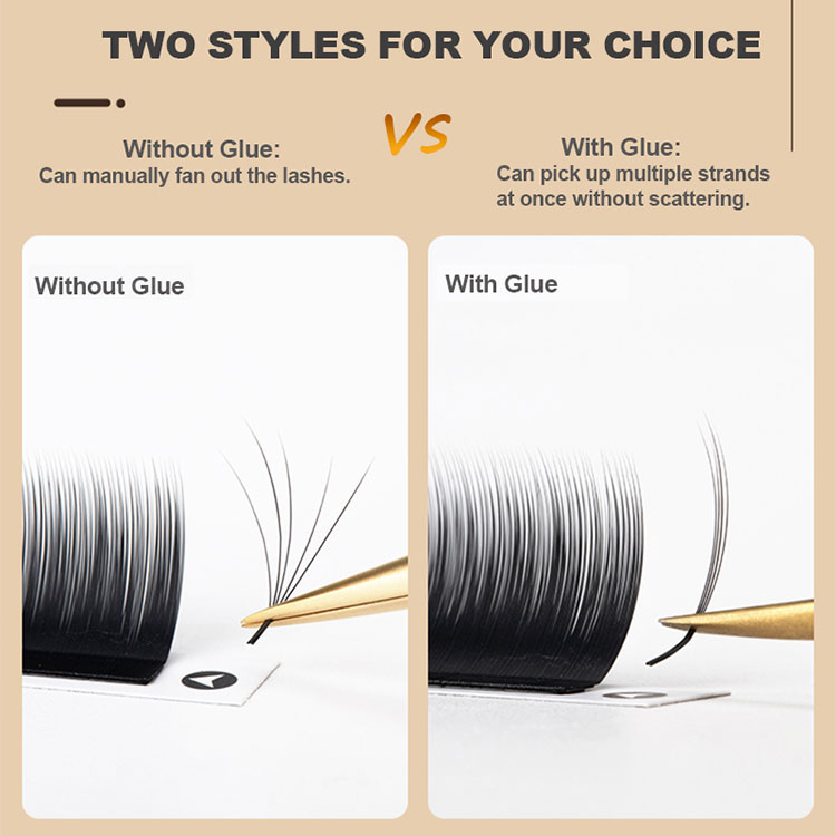 Dva stila za vašo izbiro: na voljo v dveh možnostih - z lepilom za nabiranje več pramenov hkrati brez raztresenja ali brez lepila za ročno izlivanje trepalnic, ki se ukvarjajo z različnimi nastavitvami aplikacij.
